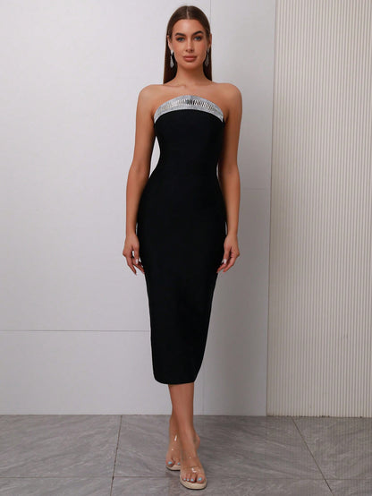 LLstyle Women Strapless Diamond-Embellished Side-Slit Bandage Dress