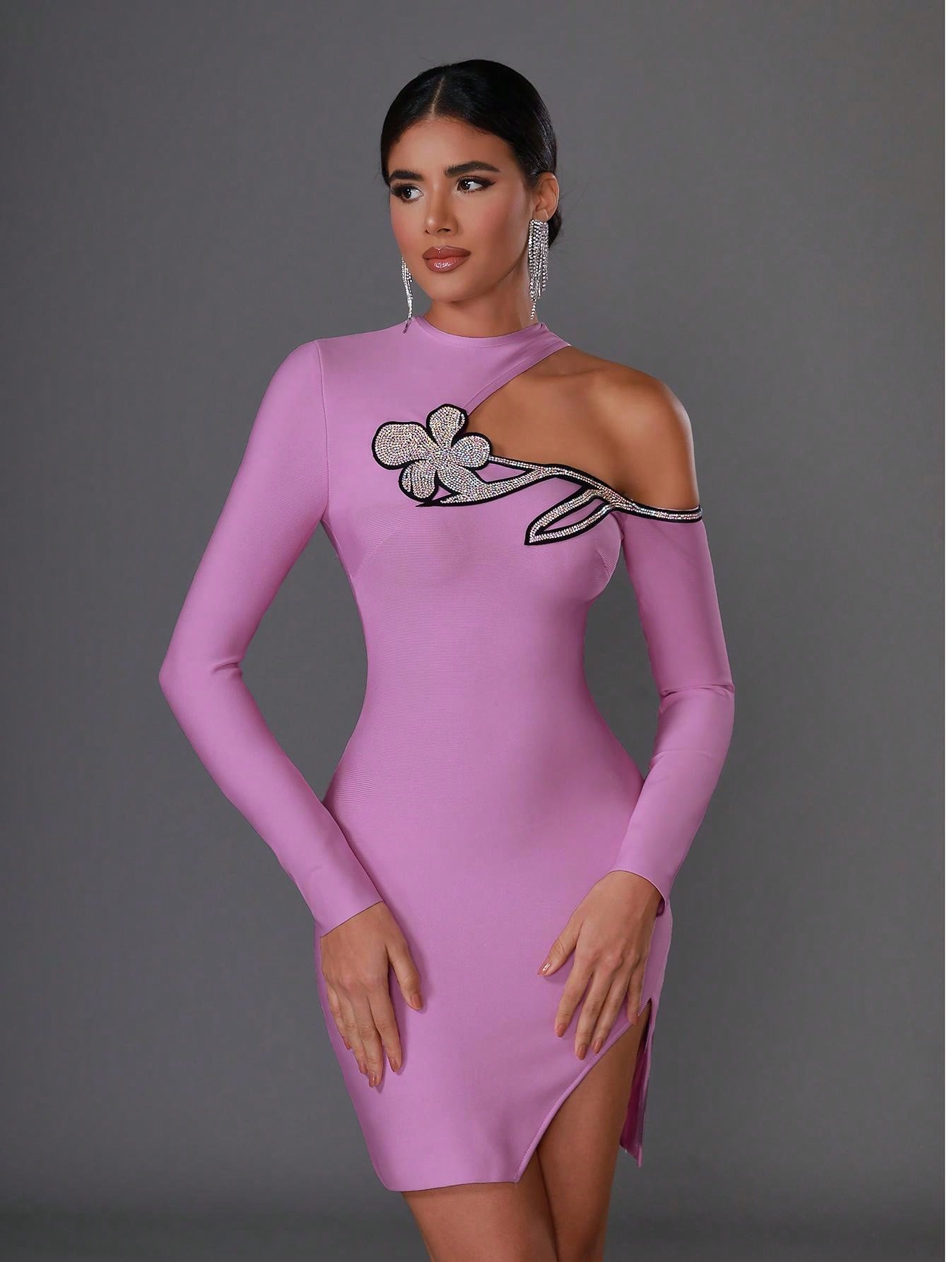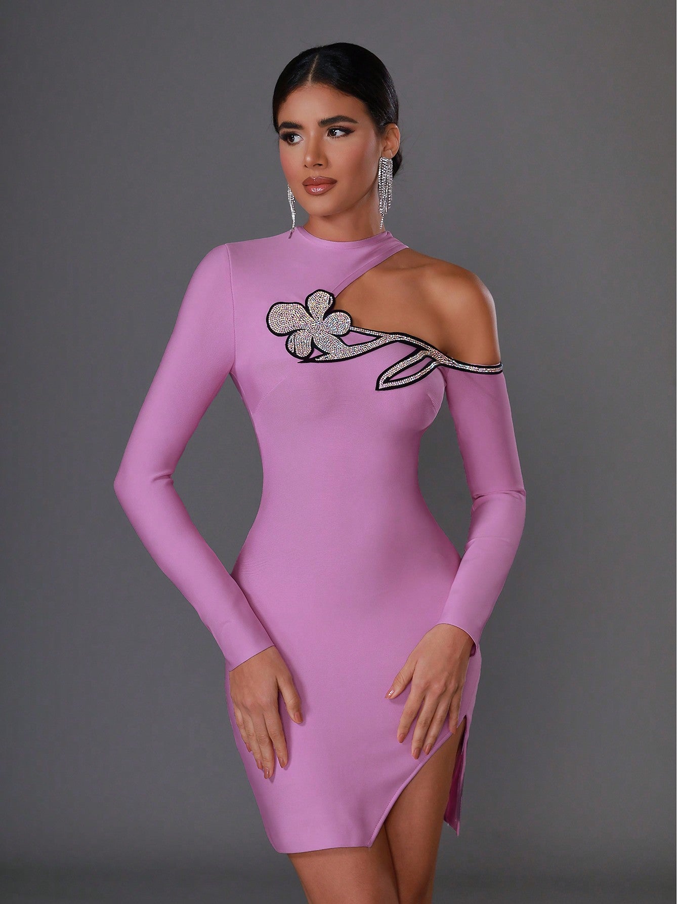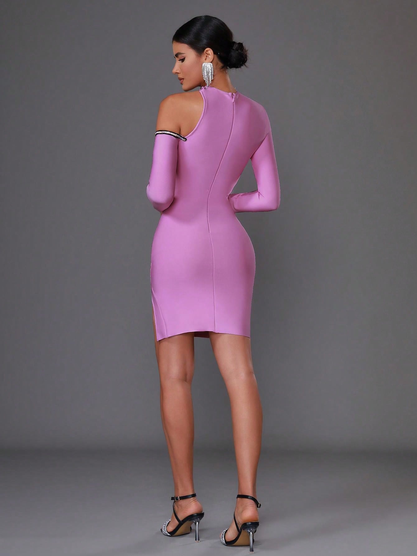 LLstyle Long Sleeve Diamond-Embellished Mesh V-Neck Dress