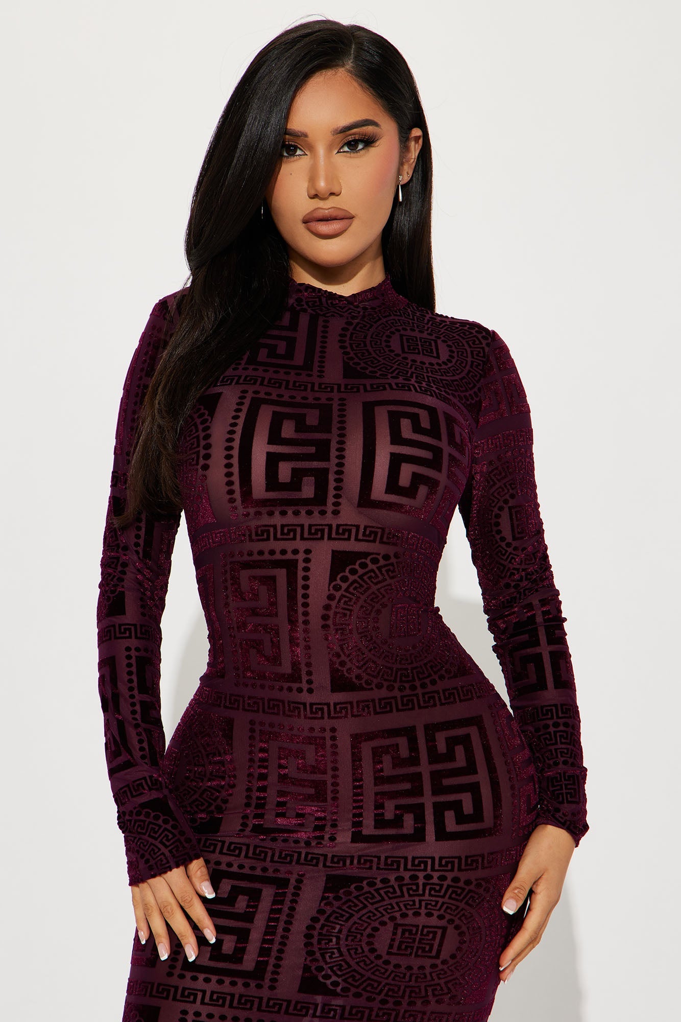 Mesh Midi Dress Velvet Burnout Design Mock Neck Long Sleeves Stretch Dress Length =49" Disclaimer Burnout Detail May Vary Shell: 50% Polyester 40% Nylon 10% Spandex Imported