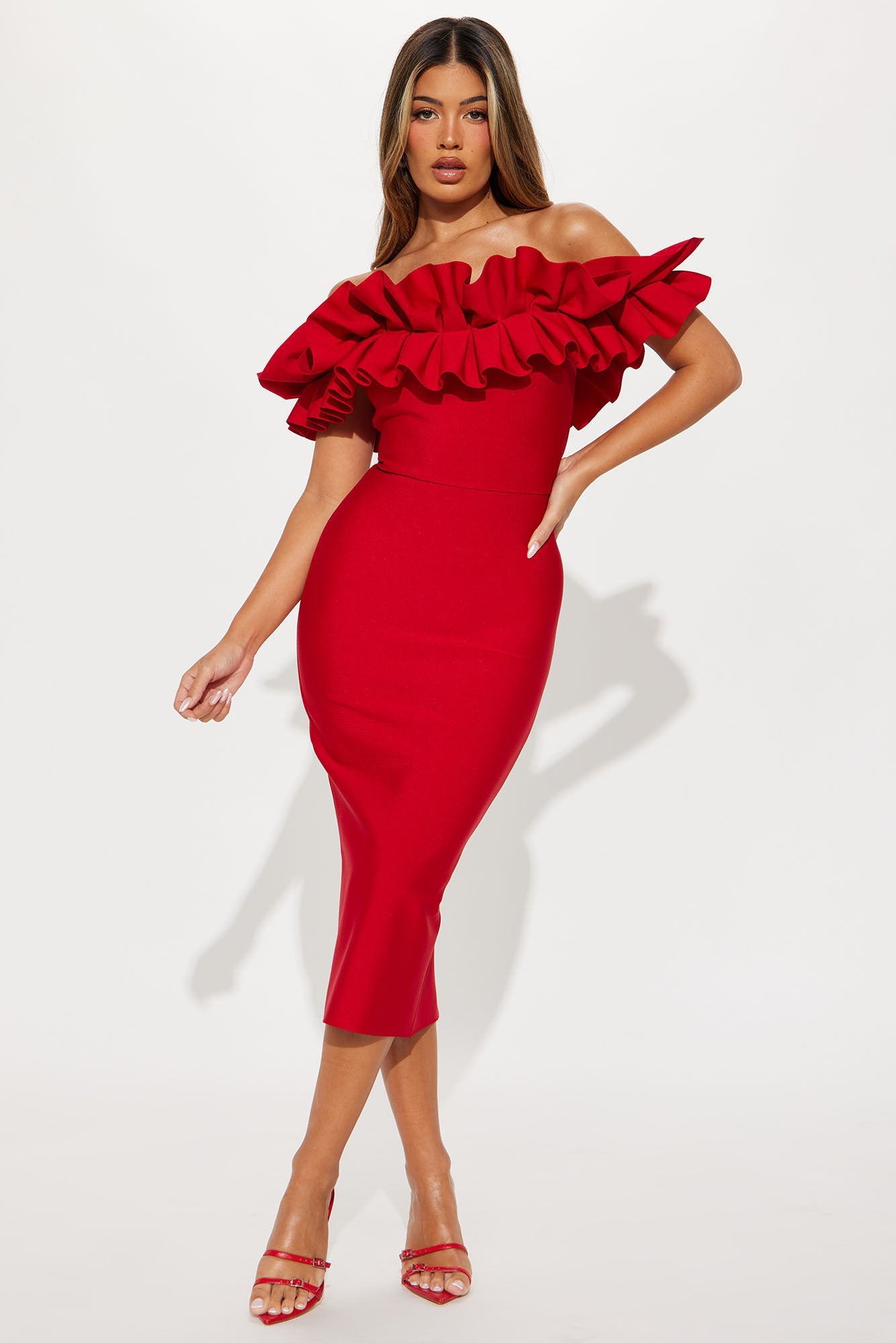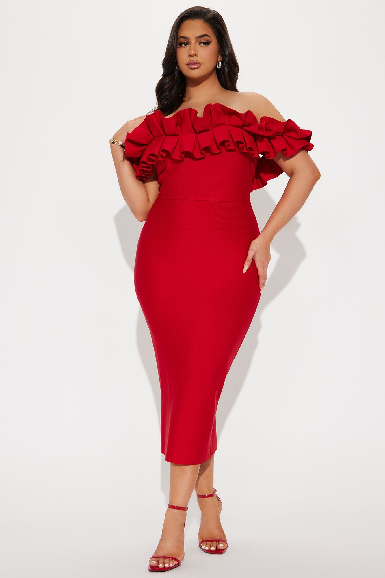 The Red Bandage Midi Dress is a striking piece designed to accentuate your curves with its sculpting stretch fabric. Featuring a sleeveless, off-shoulder design with a tube neckline and collar detail, it combines elegance with bold allure. The exposed back zipper with hook-and-eye closure adds a sleek, modern touch. With a length of 41", it falls perfectly at a refined midi length. Crafted from 92% polyester and 8% spandex, this dress is both stylish and comfortable, making it ideal for parties, nights out, or special occasions.