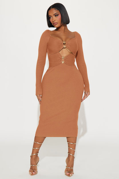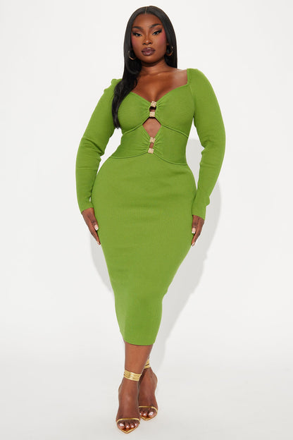 - Sweater Midi Dress V-neck Puff long sleeves Front cut out Gold hardware Stretch Length = 45" 80% Rayon 20% Nylon Imported