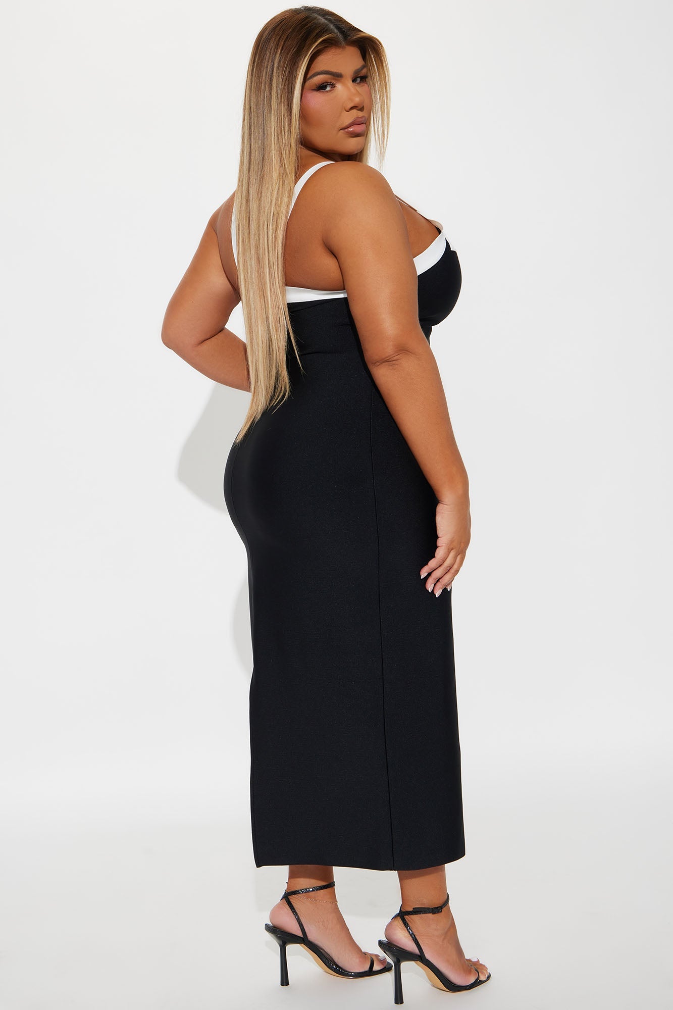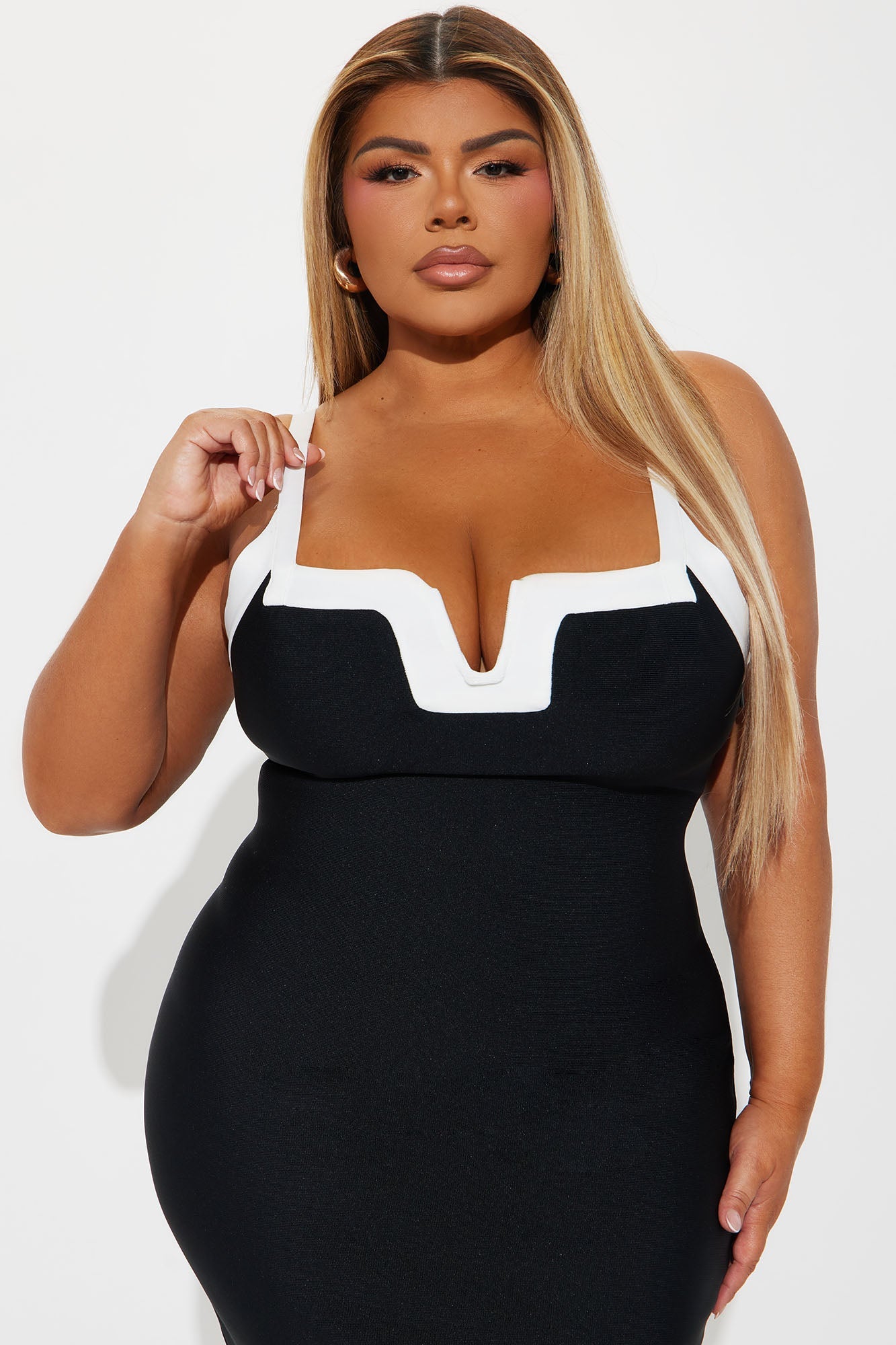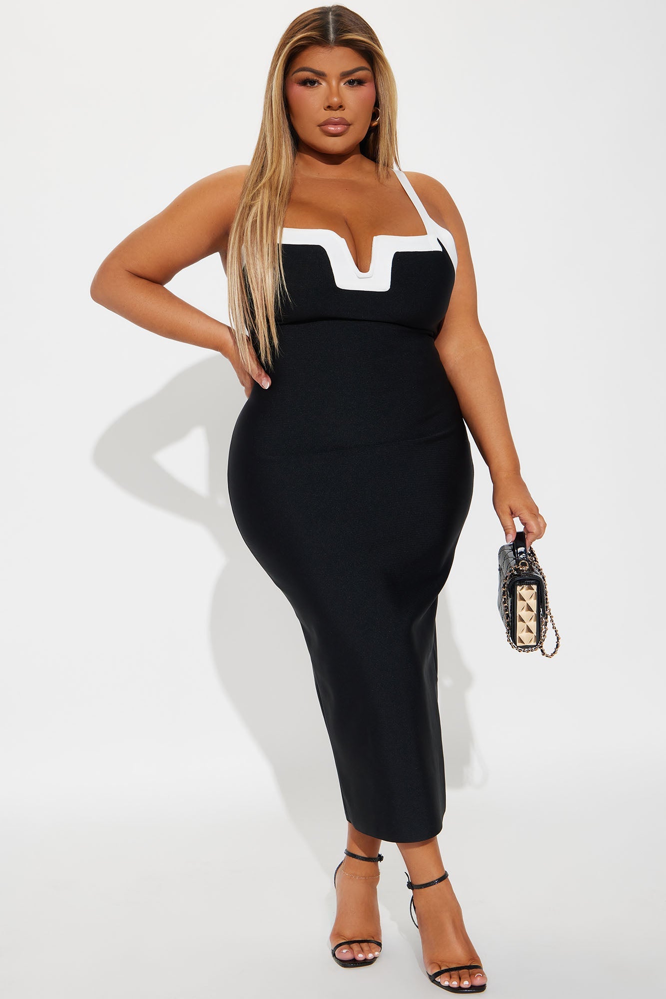 Sleek, sophisticated, and effortlessly sexy the Tracy Bandage Midi Dress is your go-to for elevated style. Crafted from luxe, curve-contouring bandage fabric, this dress hugs in all the right places while offering structure and support. The midi length adds a refined edge, perfect for both upscale evenings and chic special occasions. Featuring a flattering neckline and clean lines, Tracy is designed to turn heads with timeless elegance and modern allure.Available In Black/combo.